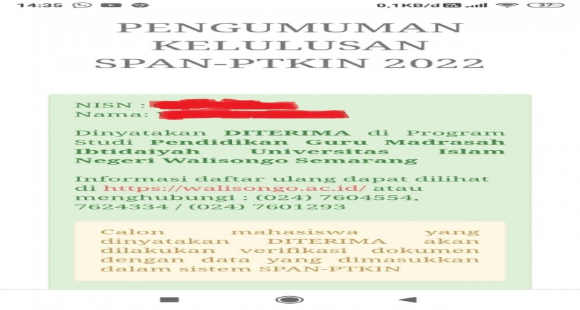 Kelulusan tersebut tertuang dalam surat Nomor B-130/SPAN-UM/IV/2022 tentang Akses Pengumuman Hasil SPAN-PTKIN tanggal 15 April 2022.